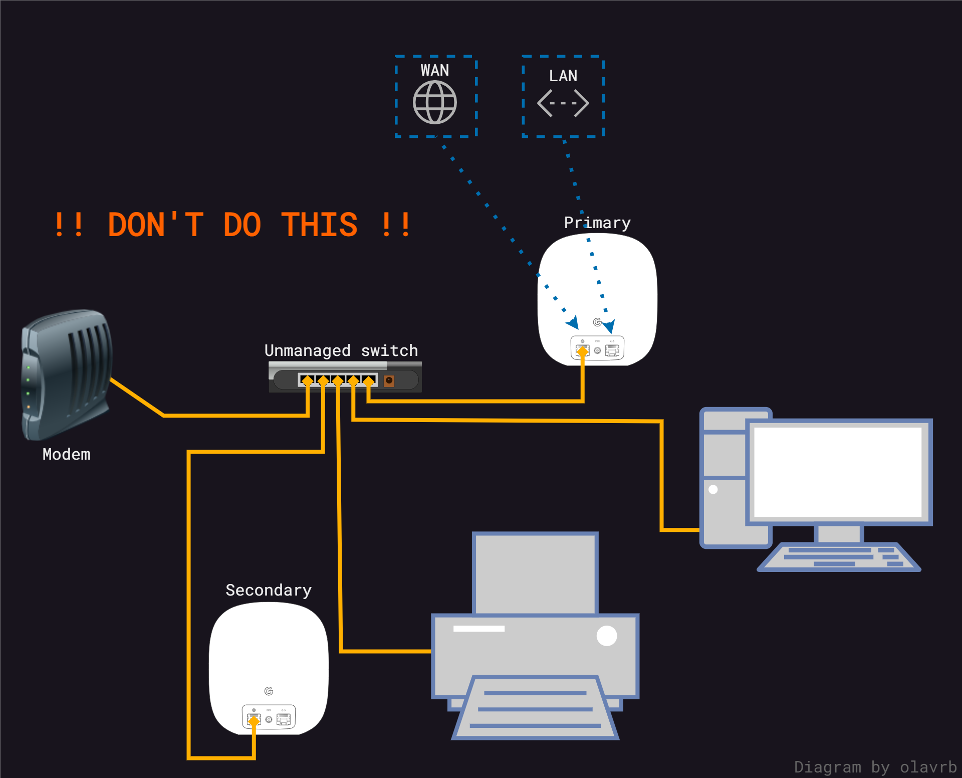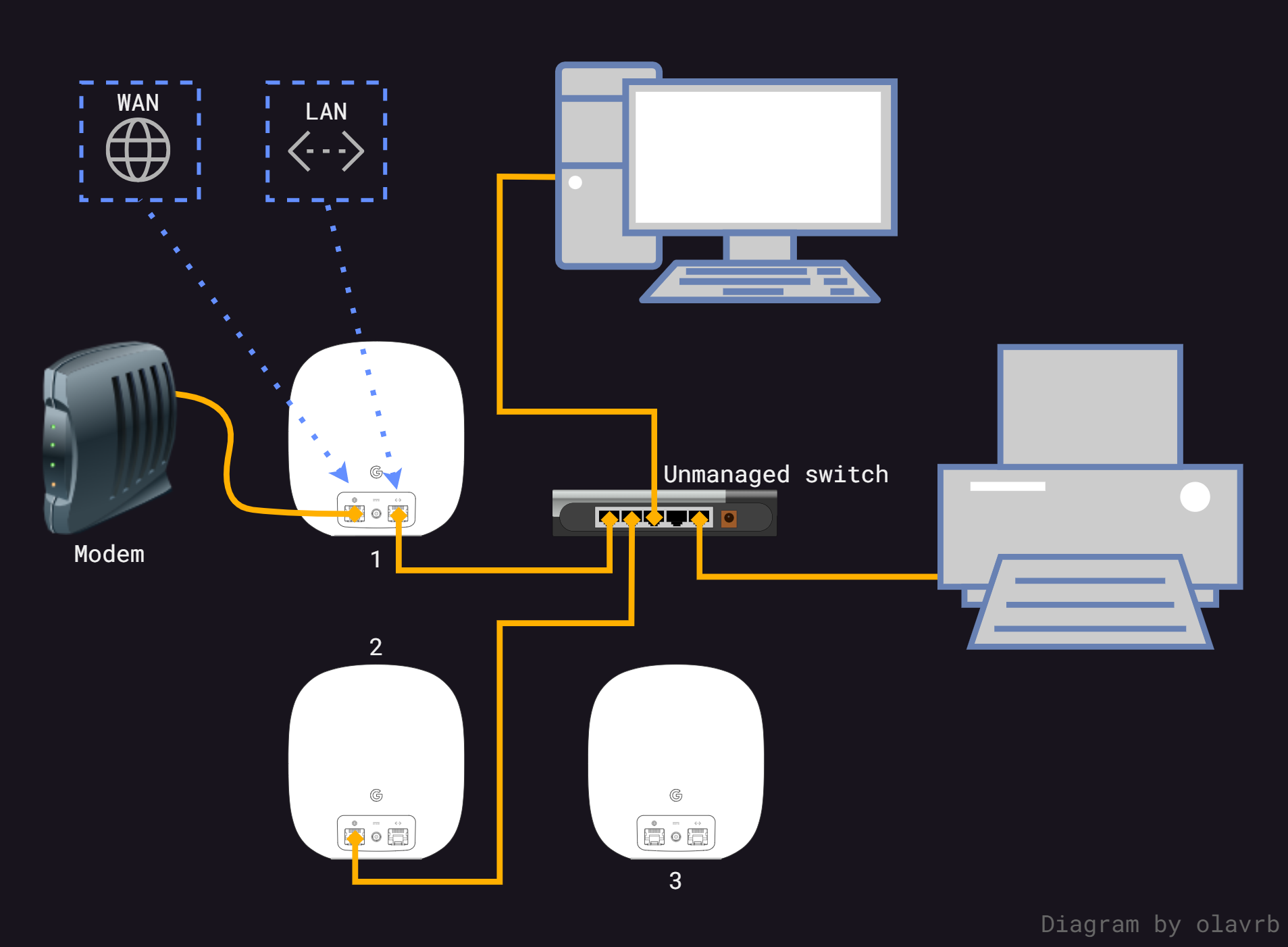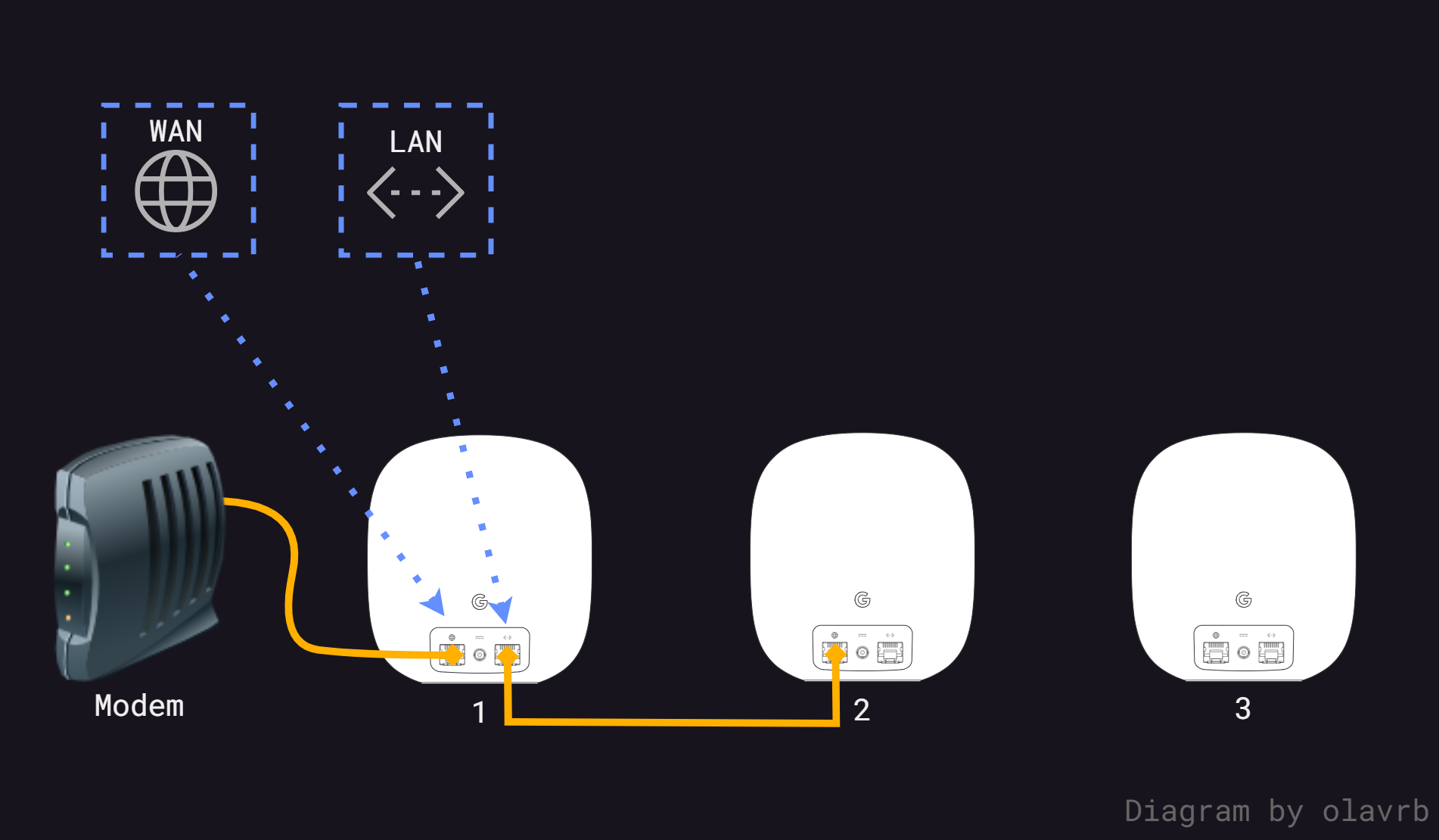 Here are some diagrams I've made to show how one should do wired backhaul with Google / Nest Wifi. The goal was to show it as simple as possible, with the audience being community users at googlenestcommunity.com.